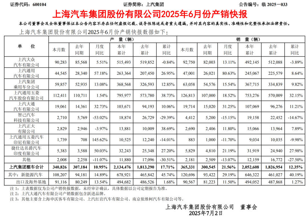 官方数据显示,2025年上半年,上汽集团累计销量为205.26万辆,同比增长12.35%。其中,新能源汽车累计销量为64.63万辆,同比增长40.19%;累计出口为49.41万辆,同比增长1.27%。